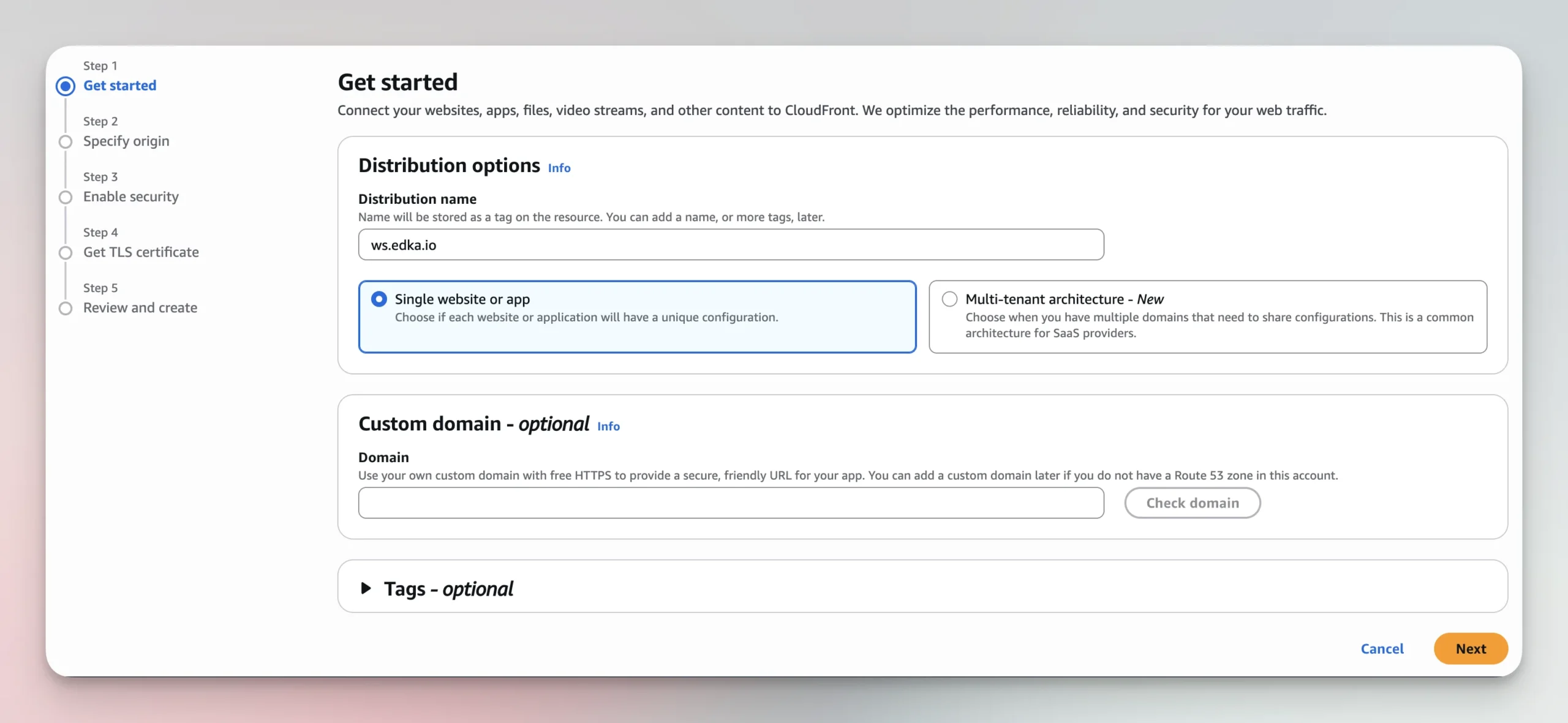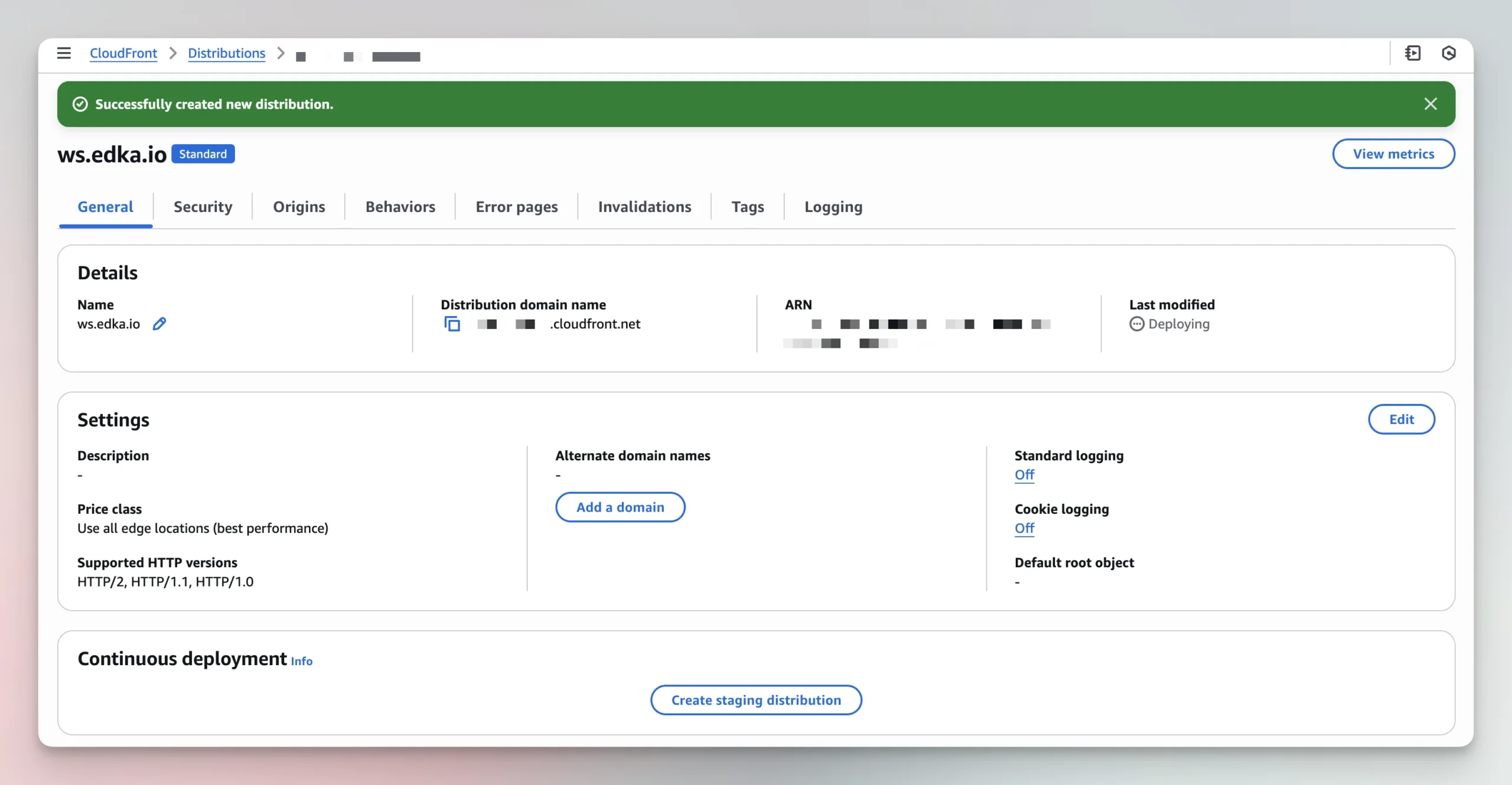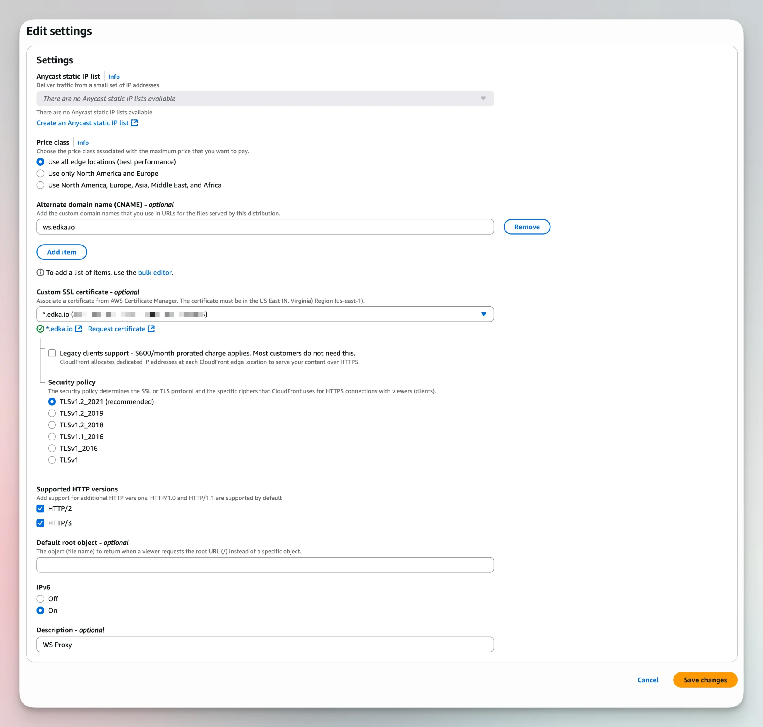 Set an “Alternate domain name (CNAME)” to your own subdomain. In this example is ws.edka.io and make sure you have a valid SSL certificate available for it. Enable both HTTP/2 and HTTP/3 and save the configuration.