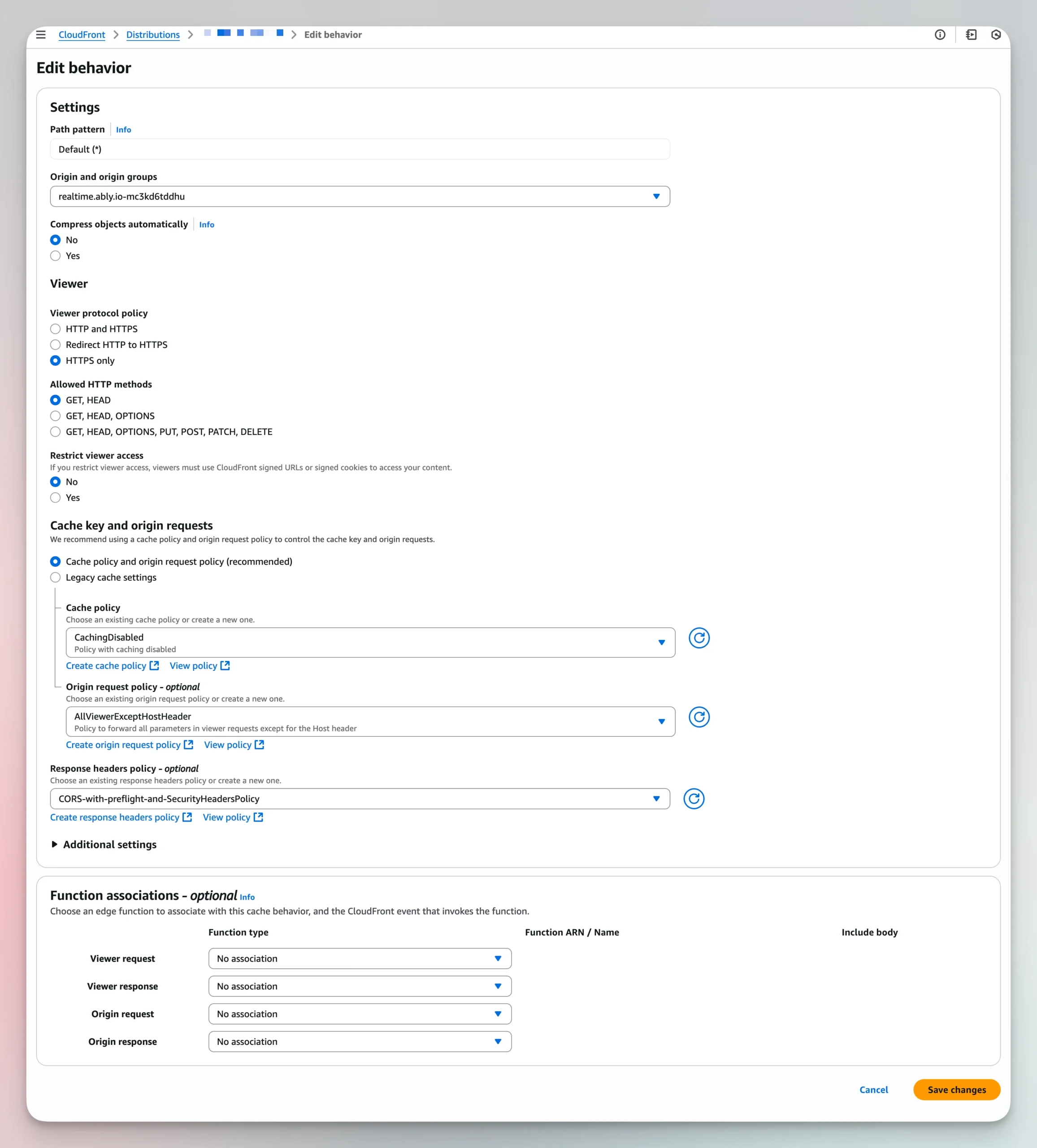 AllViewerExceptHostHeader - Set “Response headers policy” to