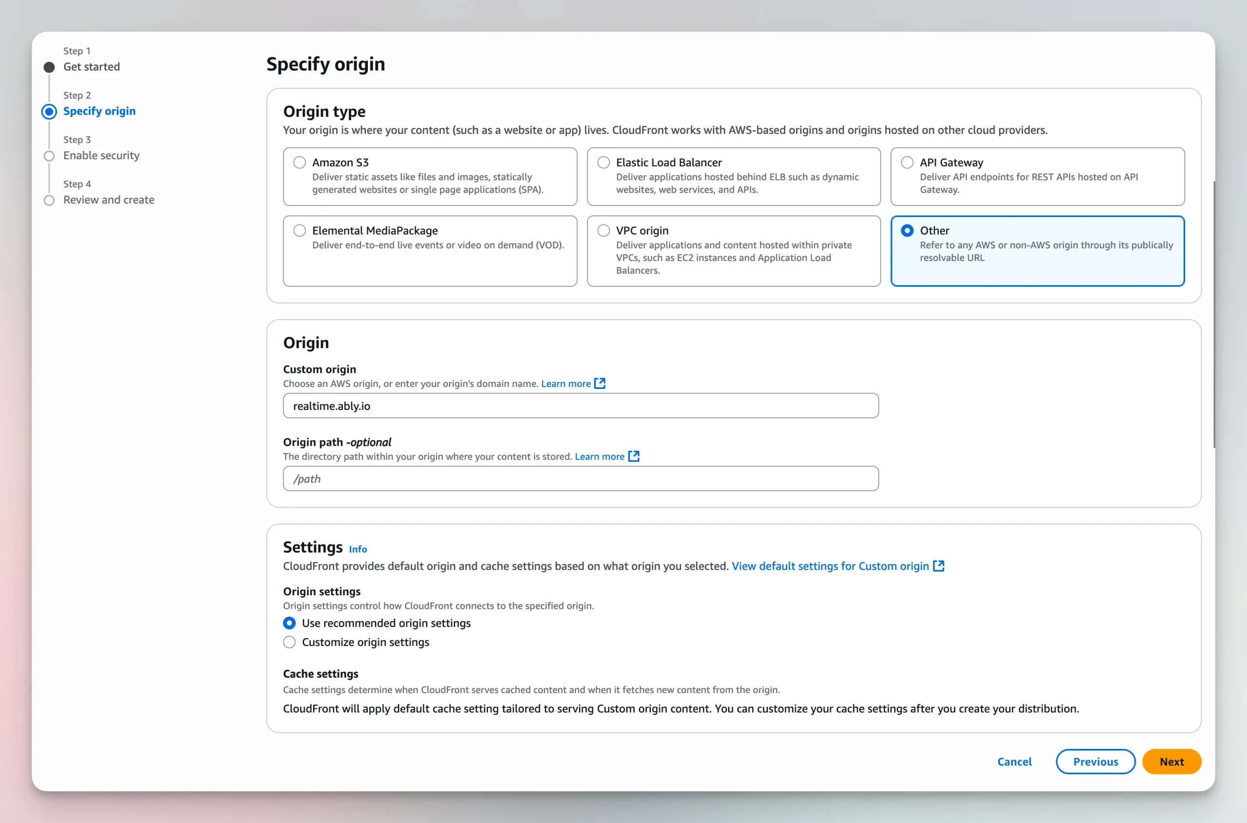Set “Origin type” to “Other” and configure your desired origin. In this example is realtime.ably.io